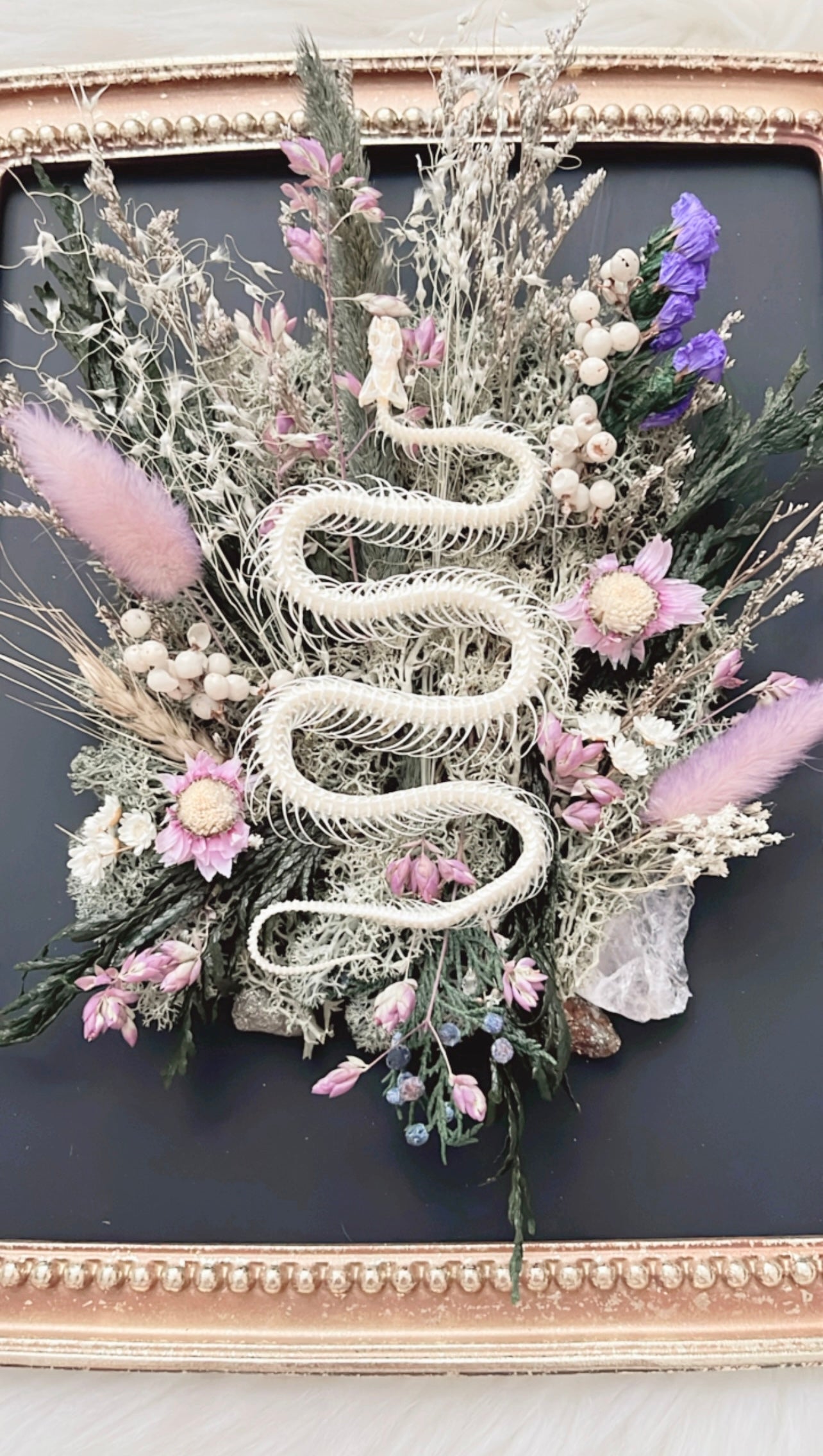 Full Snake Skeleton, Rose Quartz, Peacock Ore, Pyrite, Dried Florals and Reindeer Moss on a Painted Frame