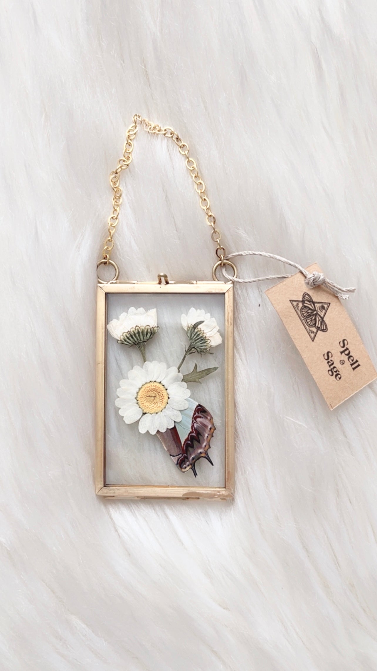 Pressed flower arrangements with butterfly wings inside a brass floating frame