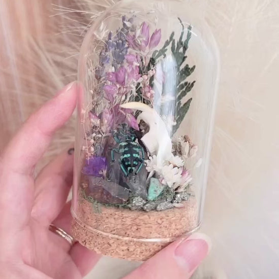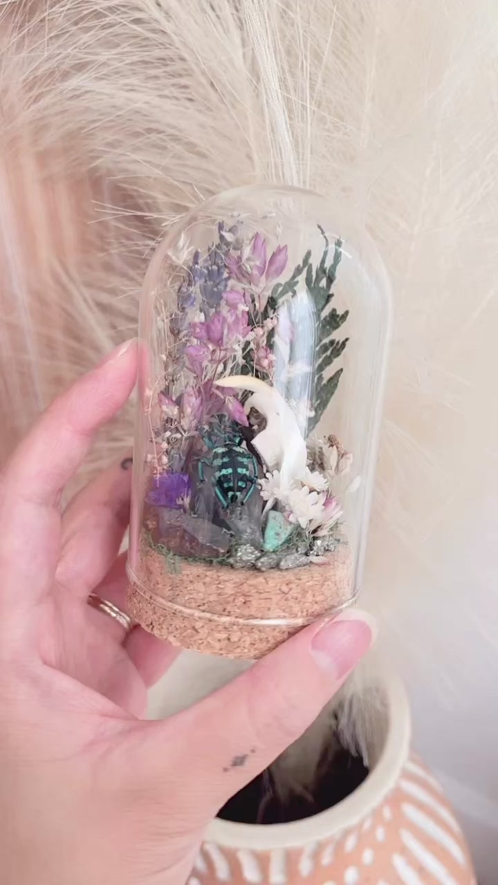 Create your own little mini world inside a terrarium using recycled nature and dried flowers! You'll be provided with a muskrat jaw and beetle pairing, along with various crystals and dried flowers.