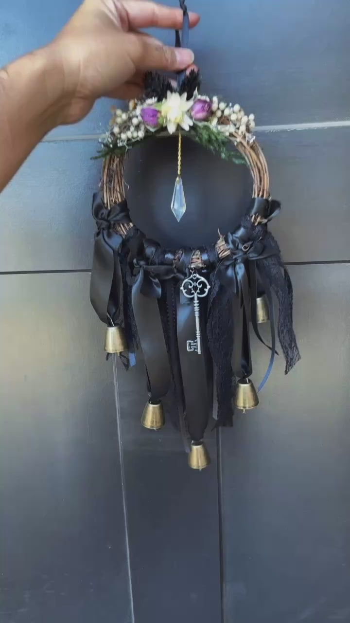 In this workshop, you will create a full moon grapevine wreath hanging, adorned with flowers, satin black ribbons, witch's bells and a brass skeleton key.