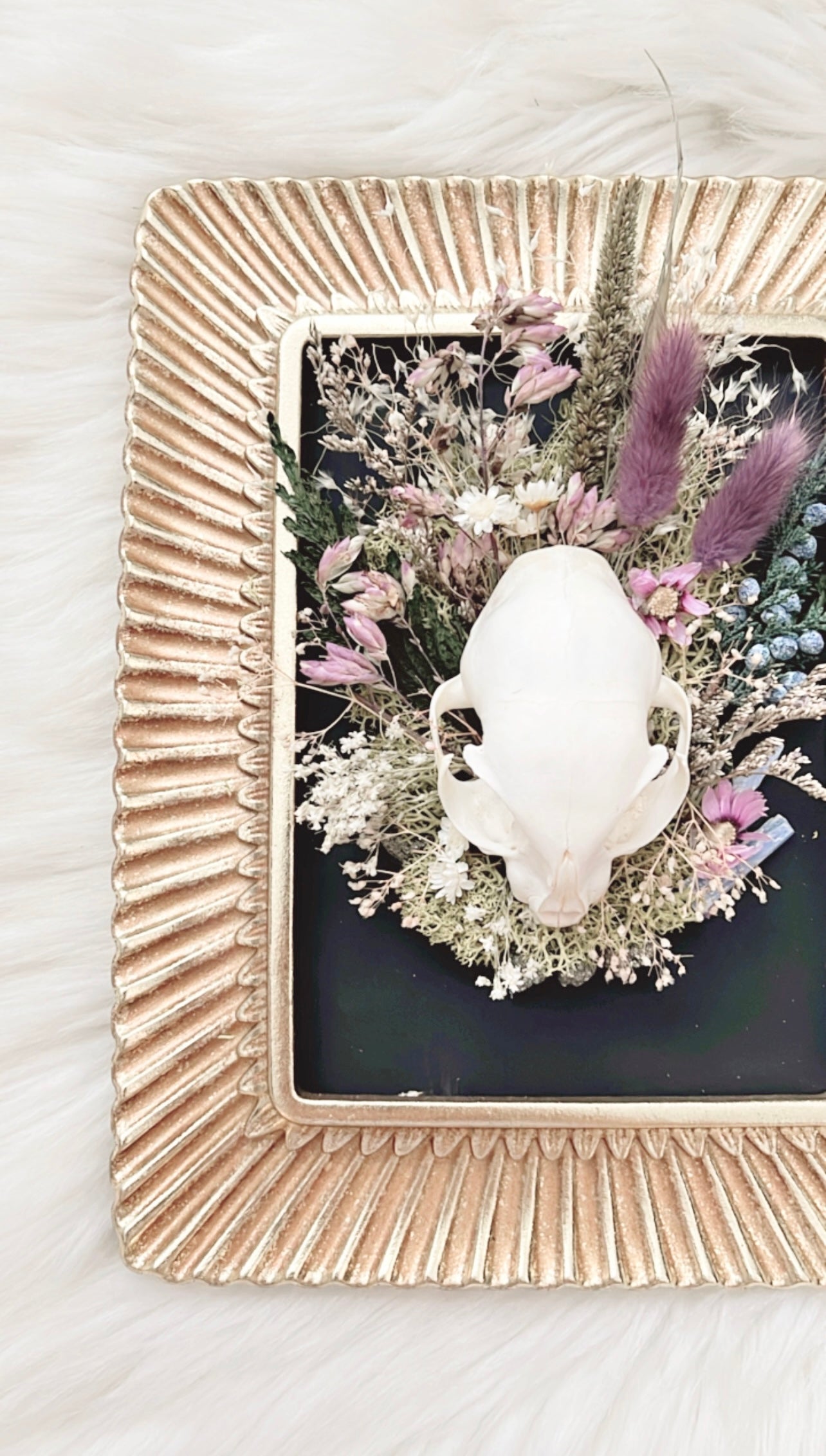Cat Skull, Blue Kyanite, Pyrite, Dried Florals and Reindeer Moss on a Painted Frame